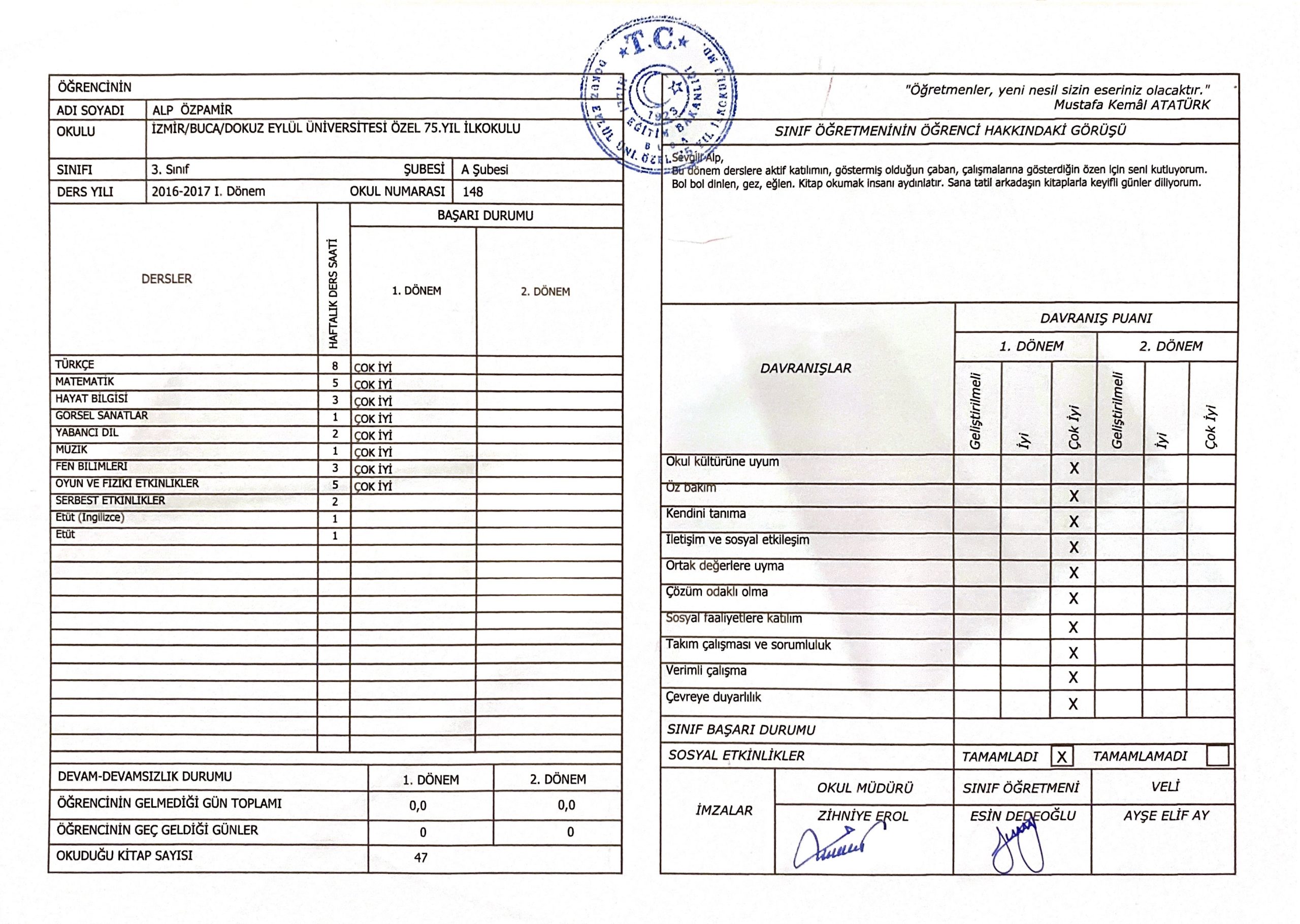 3. Sınıf - 1. Dönem Karnem (DEU 75. Yıl, Şubat 2017)