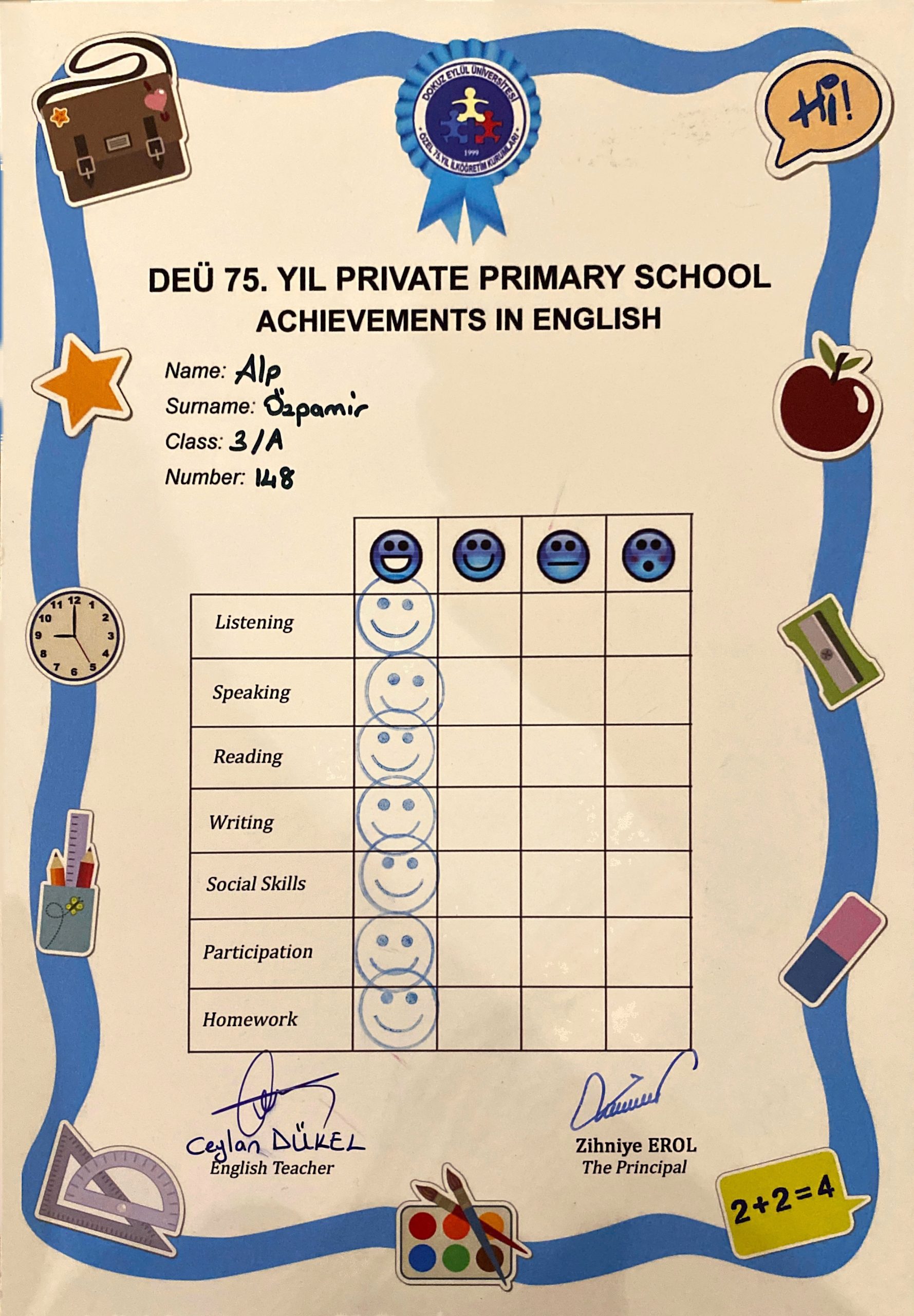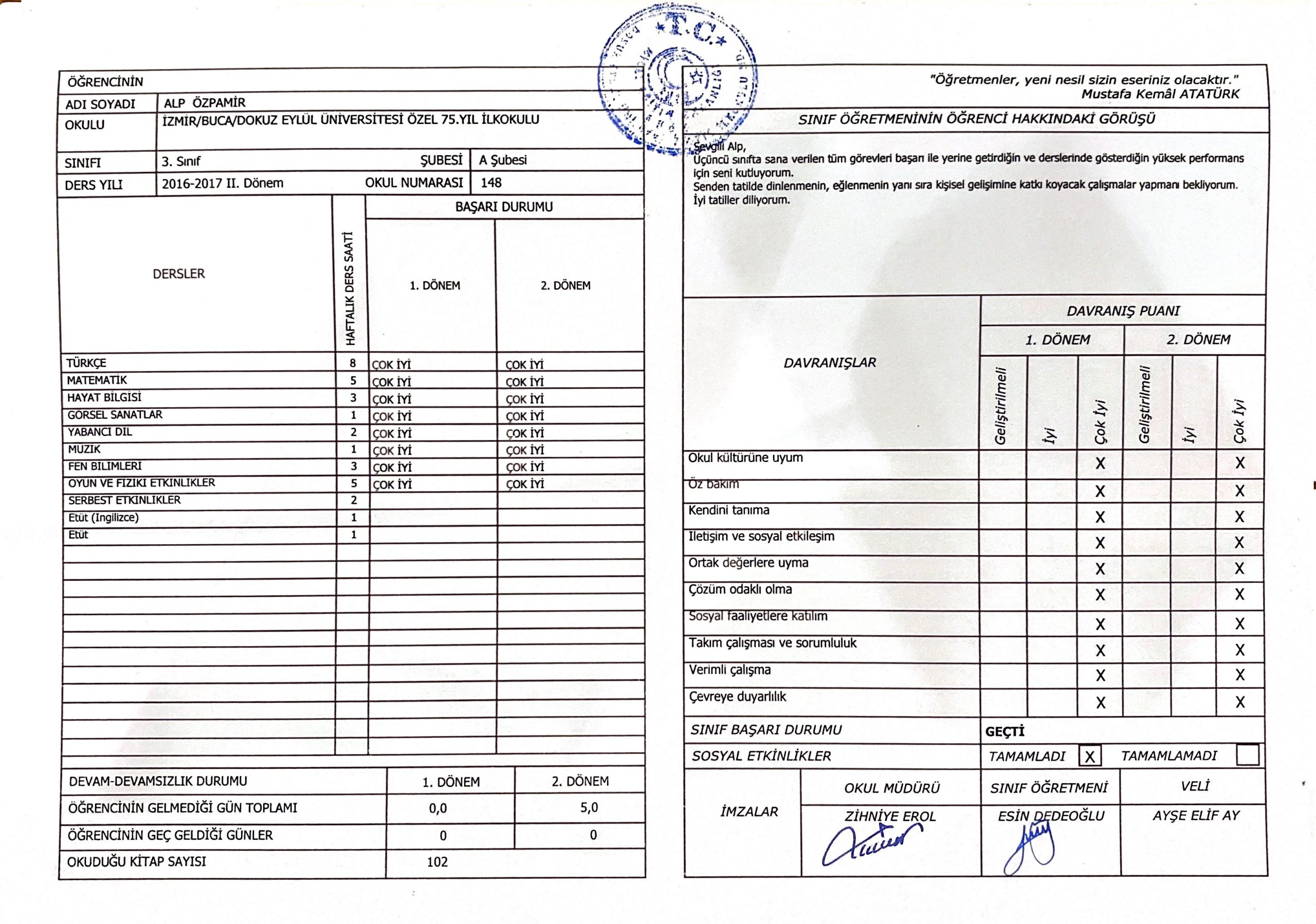 3. Sınıf - 2. Dönem Karnem (DEU 75. Yıl, Haziran 2017)