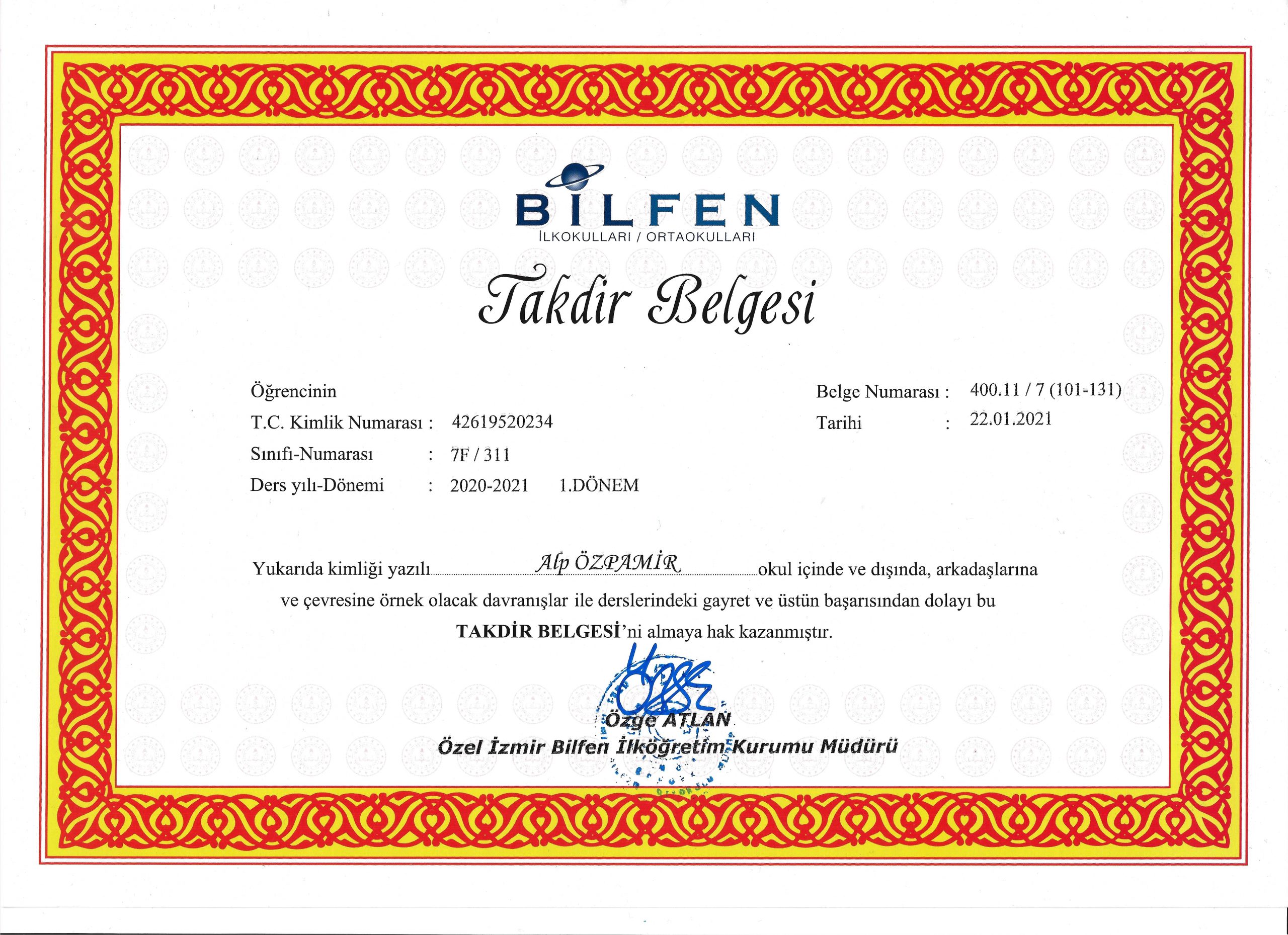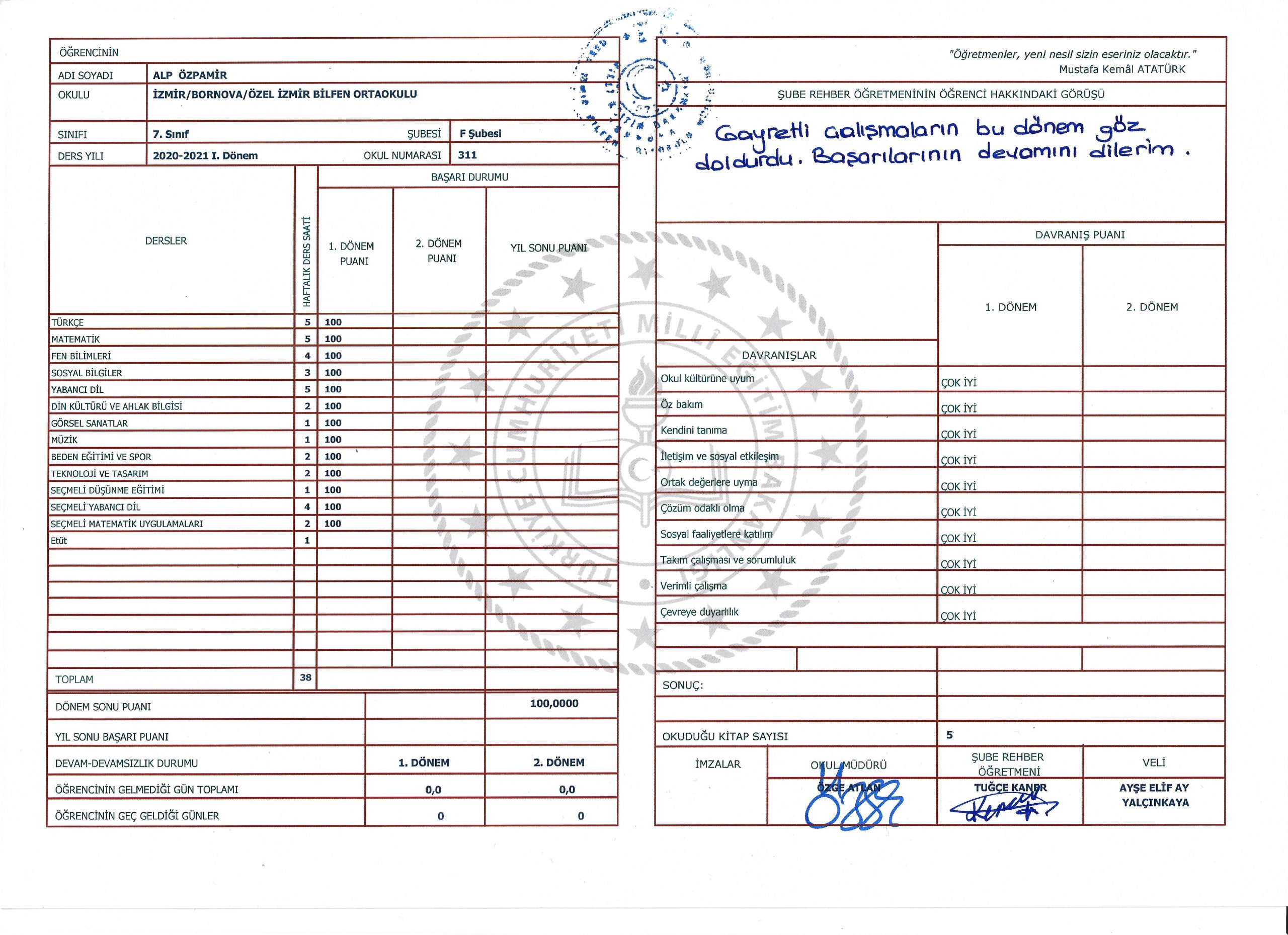 7. Sınıf - 1. Dönem Karnem (Bilfen, Ocak 2021)