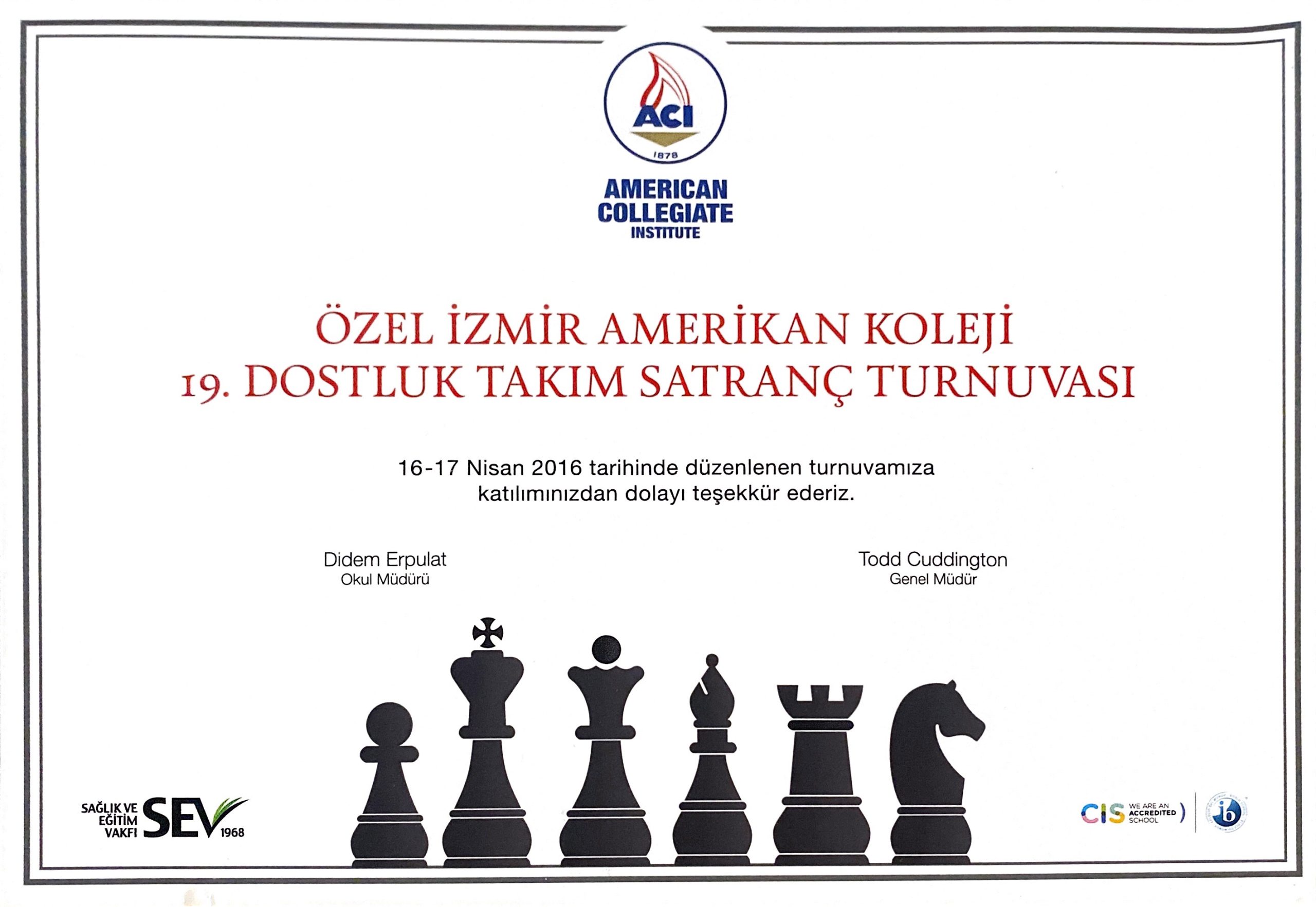 İzmir Özel Amerikan Koleji 19. Satranç Turnuvası İkincilik Ödülü (16-17 Nisan 2016)