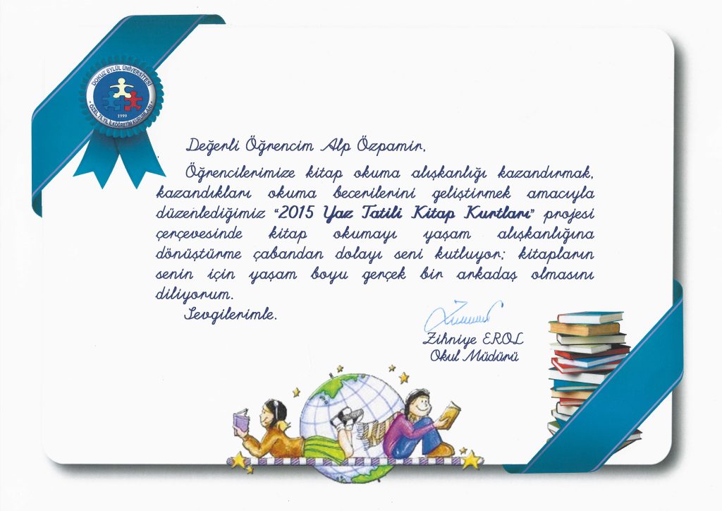 2015 yaz tatilinde öğretmenim kitap listesi vermişti. Ben de hepsini okuyup çalışmalarımı tamamladığım için “Kitap Kurdu Sertifikası” almıştım. Keşke kitap kurdu olmaya devam etseydim ve daha çok kitap okusaydım diyorum bazen LGS’ye hazırlanırken.