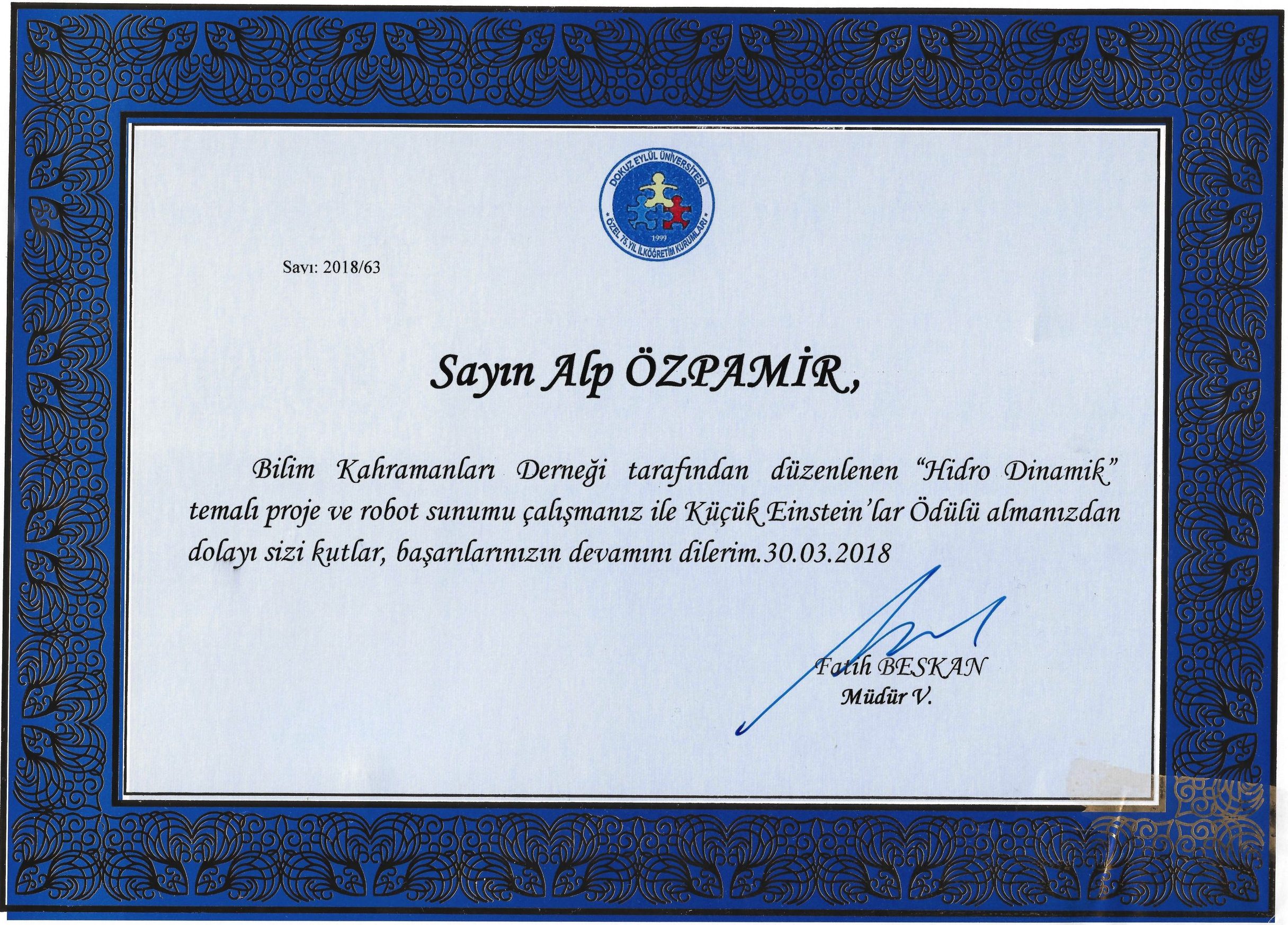 Küçük Einstein'lar Ödülü - Teşekkür Belgesi (DEU 75. Yıl, 31 Mart 2018)