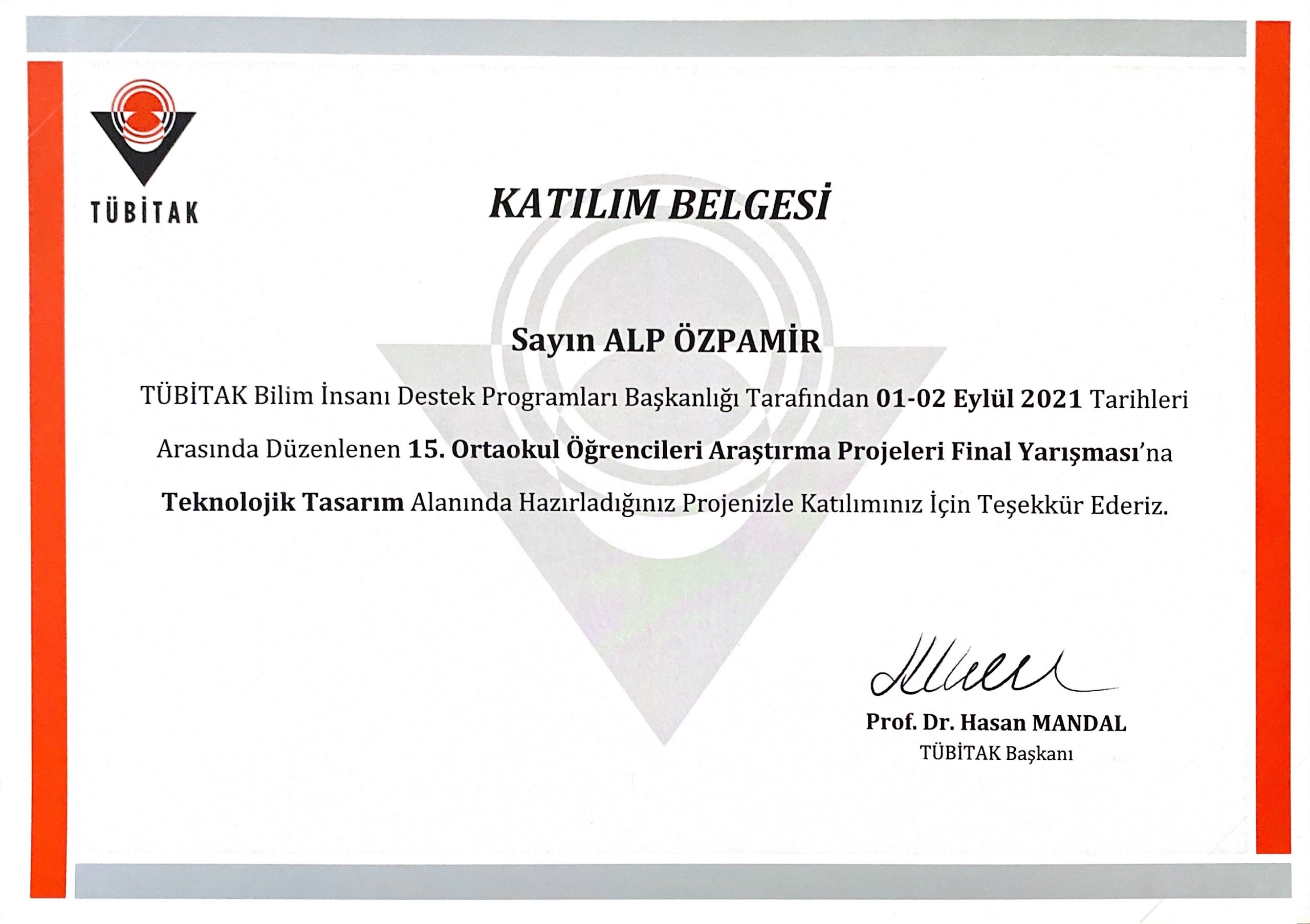 TÜBİTAK 2204-B 15. Ortaokul Öğrencileri Araştırma Projesi Yarışması Türkiye Birincisi (1-2 Eylül 2021)