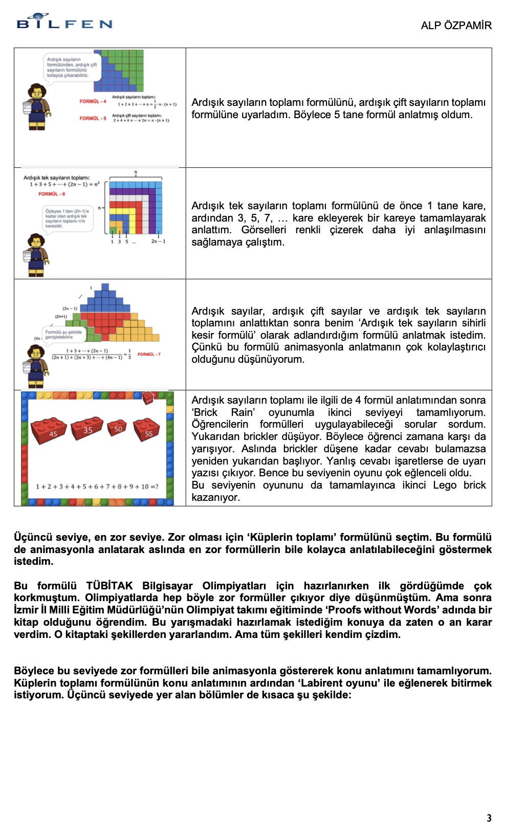 Sonrasında kodlama alanında katıldığım üç farklı proje ile ödüller aldım. Bu projeler sayesinde proje geliştirme sürecini öğrenmiş oldum. Her projemi LEGO® tutkumla birleştirerek projelerimi keyiflli hale getirdim. (https://www.instagram.com/alp_brick/)