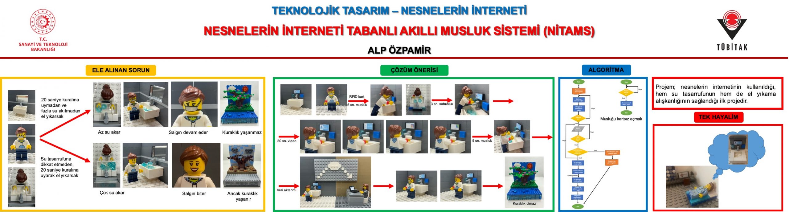 Pandemi döneminde el yıkama kurallarını öğretme amaçlı geliştirdiğim “Nesnelerin İnterneti Tabanlı Akıllı Musluk Sistemi” isimli projemle TÜBİTAK Araştırma Projeleri Yarışmasında Türkiye Birincisi oldum. (https://alpozpamir.com/etkinliklerim/tubitak-projem/)